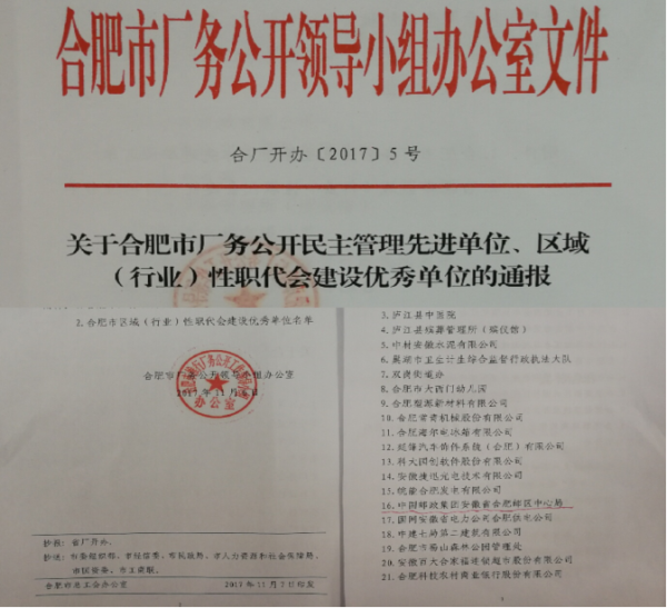 近日,從合肥市總工會獲悉,合肥郵區(qū)中心局榮獲2017年度合肥市廠務公開民主管理先進單位稱號。多年來,在上級工會重視關心下,我局堅持以服務大局、服務改革、服務基層為工會工作中心,不斷推進我局廠務公開民主管理制度化、規(guī)范化、法制化、標準化建設,激發(fā)廣大職工的主人翁精神,維護和保障廣大職工的民主政治權利,建立和諧的勞動關系。