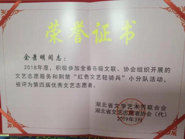 3月12日至13日,湖北省文聯(lián)十屆二次全委會在武漢召開,會議表彰了第四屆湖北省最美文藝志愿者和優(yōu)秀文藝志愿者。武漢郵政藝術(shù)團(tuán)歌唱演員余景明蟬聯(lián)湖北省優(yōu)秀文藝志愿者稱號。