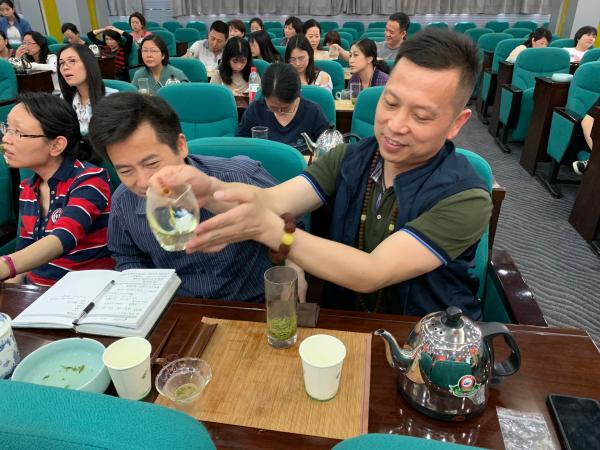 當(dāng)天上午,首期培訓(xùn)的主要內(nèi)容是中國茶文化脈絡(luò)、飲茶與健康、中國茶葉分類、綠茶加工工藝、綠茶沖泡方法與實(shí)操、綠茶功效與儲(chǔ)存。熊老師一邊示范一邊熱情地為大家講解茶學(xué)知識(shí),從“識(shí)茶、品茶、茶禮儀、茶與健康、茶與修養(yǎng)等有關(guān)茶文化知識(shí)進(jìn)行了細(xì)致的講解和示范,及沖泡技術(shù)。