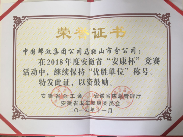 4月20日下午,市總工會召開全市工會十二屆十二次全體(擴大)會議,會上馬鞍山市郵政市分公司受到表彰,榮獲“2018年度安徽省安康杯競賽優(yōu)勝單位”稱號。