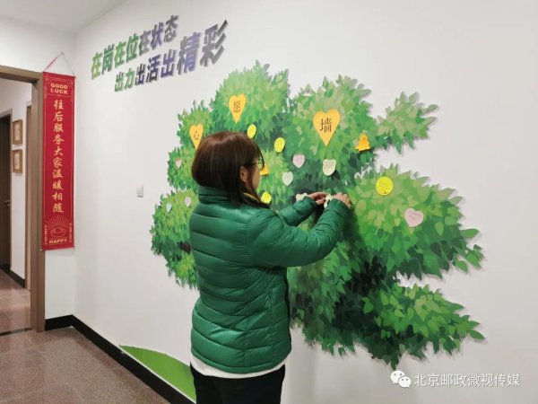 職工小家四周特別設(shè)計了員工“心愿樹”、職工文化墻; 豐臺區(qū)方莊郵政支局副局長、部門工會主席王麗萍介紹道:“臨近春節(jié),很多員工都在‘心愿樹’上寫下了新年愿望,你們看現(xiàn)在這棵樹越來越‘枝繁葉茂’了!同時,我們把員工日常開發(fā)的業(yè)務(wù)產(chǎn)品、職工藝術(shù)作品添加到了職工文化墻上,將大家的智慧成果集中展示在小家這塊新天地里,也是我們這次建家的特別用意?!?/p>