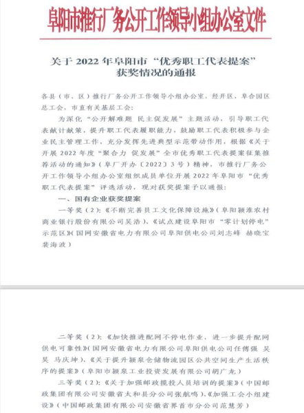 近日,在阜陽市2022年度“聚合力 促發(fā)展”全市優(yōu)秀職工代表提案征集推薦活動中,太和縣、界首縣郵政工會上報的《關(guān)于加強郵政攬投人員培訓(xùn)的提案》及《加強工會小組建設(shè)提案》,分別榮獲全市國有企業(yè)提案三等獎。