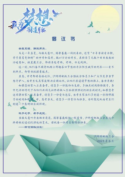 前日,沙坪壩區(qū)分公司行政及工會(huì)連續(xù)第三年發(fā)起《倡議書》,號(hào)召全體干部職工爭(zhēng)當(dāng)夢(mèng)想守護(hù)人,為考生及家長(zhǎng)創(chuàng)造良好應(yīng)試環(huán)境。此舉得到基層員工的一直好評(píng)。