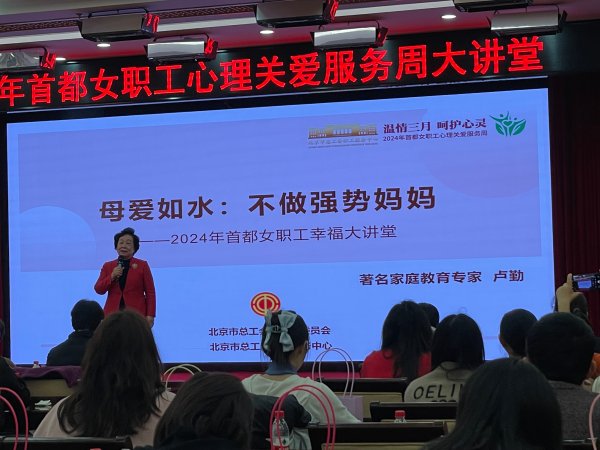 3月4日下午,北京市總工會女職工委員會和北京市總工會職工服務(wù)中心聯(lián)合開展的2024年“溫情三月,呵護心靈”女職工心理關(guān)愛服務(wù)周活動拉開帷幕。 在市分公司工會的協(xié)調(diào)下,通信局工會組織部分女職工參加由著名家庭教育專家、中國少年兒童新聞出版總社原總編輯、首席教育專家、全國三八紅旗手盧勤老師講授的主題為“母愛如水:不做強勢媽媽”的講座。