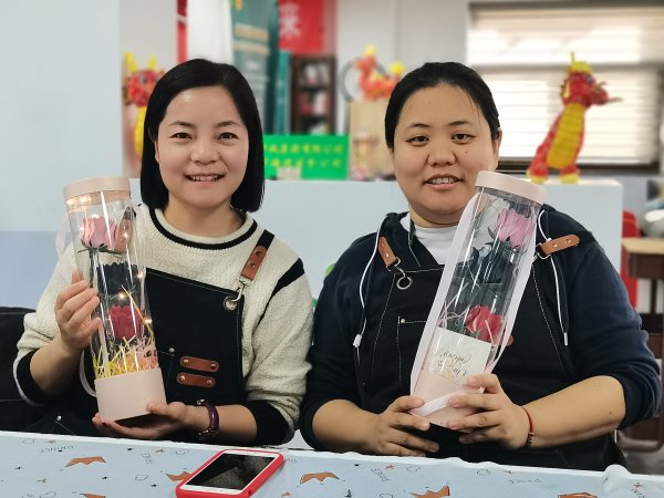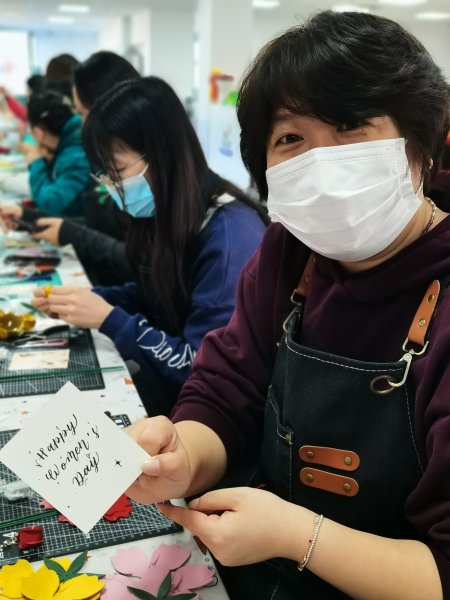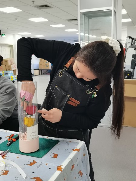 老師首先講述了皮革的基本知識,隨后為大家講解皮革玫瑰花的制作流程,跟隨老師的講解,大家各自挑選了自己喜歡的皮革顏色,迫不及待地開始動手體驗。一朵朵花瓣在大家的巧手中變得生動美麗,經(jīng)過一番精心制作,一朵朵嬌艷欲滴的漂亮玫瑰花便制作完成。大家將親手制作的玫瑰花插入透明花桶,用燈帶點綴?;顒蝇F(xiàn)場還為大家準備了“女神節(jié)快樂”的手寫卡片,將卡片放入花桶,打開燈的瞬間幸福感、氛圍感拉得滿滿的。