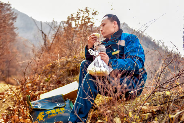 長年累月奔波在深山郵路上,陪伴張磊的只有郵車和山風(fēng)。到了冬天,山上氣溫低,下完雪很久才能化。走在山中,寒風(fēng)陰冷刺骨,他常身上冒著汗,鼻子、耳朵卻凍得發(fā)紫,兩條褲腿上都結(jié)著冰。平時,他很少能安安心心吃頓午飯,經(jīng)常是早上出班時,郵包里裝點包子或者饅頭、咸菜,中午餓了,白開水就包子就是一頓午餐。