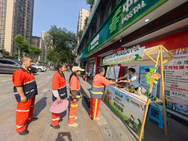 8月15日,榮昌郵政工會組織開展“郵愛驛站送清涼,真情服務(wù)暖人心”活動。總經(jīng)理朱軍帶隊為環(huán)衛(wèi)工、快遞員、外賣人員、交巡警等戶外勞動者送去防暑物資,用實際行動為酷暑中的堅守者撐起 “遮陽傘”。